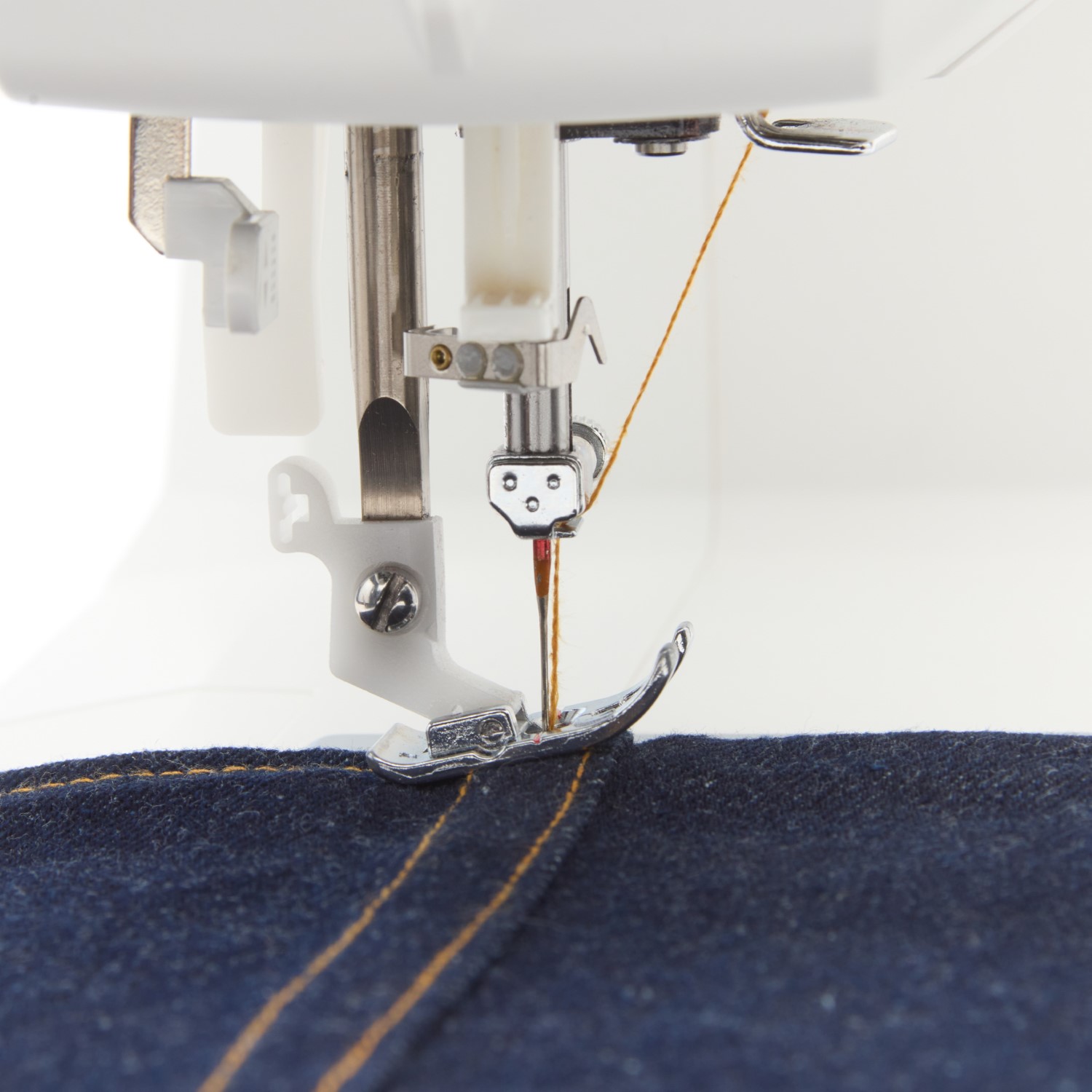 Koneen suuri lävistysvoima ja jopa 1 000 tikkiä/min nopeus takaavat tasaisen ja laadukkaan lopputuloksen myös farkkujen, verhoilukankaiden ja muiden haastavien materiaalien kanssa. Säädettävä paininjalan puristus, langankireys, ompeleen pituus ja leveys antavat sinulle täyden hallinnan. 🎛️👖